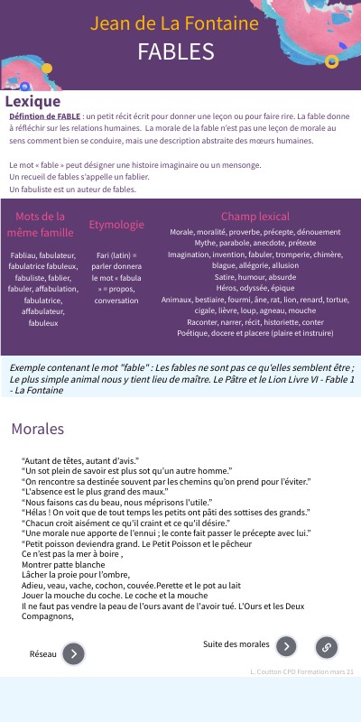 Morale, moralité, proverbe, précepte, dénouementMythe, parabole, anecdote, prétexteImagination, invention, fabuler, tromperie, chimère, blague, allégorie, allusionSatire, humour, absurdeHéros, odyssée, épiqueAnimaux, bestiaire, fourmi, âne, rat, lion, renard, tortue, cigale, lièvre, loup, agneau, moucheRaconter, narrer, récit, historiette, conterPoétique, docere et placere (plaire et instruire)