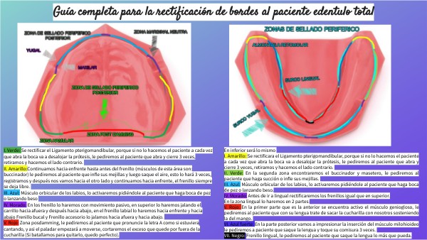 I. Verde: Se rectificar el Ligamento pterigomandibular, porque si no lo hacemos el paciente a cada vez que abra la boca va a desalojar la prótesis, le pediremos al paciente que abra y cierre 3 veces, retiramos y hacemos el lado contrario. II. Amarillo:Continuamos hacia enfrente hasta antes del frenillo (músculos de esta área son: buccinador) le pediremos al paciente que infle sus mejillas y luego saque el aire, esto lo hará 3 veces, registramos y después nos vamos hacia el otro lado y continuamos hacia enfrente, el frenillo siempre se deja libre. III. Azul: Músculo orbicular de los labios, lo activaremos pidiéndole al paciente que haga boca de pez o lanzando beso IV. Morado: En los frenillo lo haremos con movimiento pasivo, en superior lo haremos jalando el carrillo hacia afuera y después hacia abajo, en el frenillo labial lo haremos hacia enfrente y hacia abajo Frenillo bucal y Frenillo accesorio lo jalamos hacia afuera y hacia abajo. V. Rojo: Zona posdamming, le pediremos al paciente que pronuncie la letra A como si estuviera cantando, y asi el paladar empezará a moverse, cortaremos el exceso que quede por fuera de la cucharilla (Si batallamos para quitarlo, quedo perfecto).