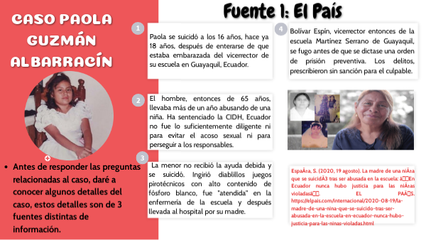 Carranza Jimenez, D. C. (2020, 10 diciembre). Ecuador reconoce responsabilidad en caso de Paola Guzmán, joven que se suicidó tras ser víctima de abusos sexuales. Anadolu Agency. https://www.aa.com.tr/es/mundo/ecuador-reconoce-responsabilidad-en-caso-de-paola-guzm%C3%A1n-joven-que-se-suicid%C3%B3-tras-ser-v%C3%ADctima-de-abusos-sexuales/2071685#