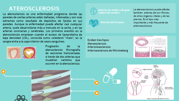 La aterosclerosis es una enfermedad progresiva donde las paredes de ciertas arterias están dañadas, infamadas y son más estrechas como resultado de depósitos de lípidos en sus paredes. Aunque la enfermedad puede afectar casi cualquier arteria, suele desarrollarse más a menudo en la aorta, y en las arterias coronarias y cerebrales. Los primeros eventos en la aterosclerosis empiezan cuando el exceso de lipoproteína de baja densidad (LDL), conocida como colesterol “malo”, en la sangre entra a la capa interior de vasos sanguíneo.