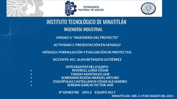 UNIDAD 3: "INGENIERÍA DEL PROYECTO" ACTIVIDAD 1: PRESENTACIÓN EN GENIALLY MÓDULO: FORMULACIÓN Y EVALUACIÓN DE PROYECTOS. DOCENTE: M.C. ALAN BETANZOS GUTIÉRREZ INTEGRANTES DEL EQUIPO: