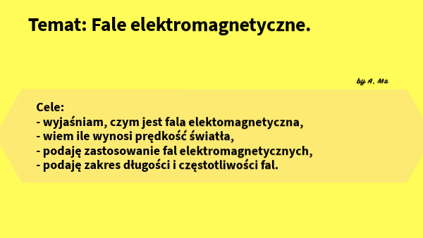 Cele: - wyjaśniam, czym jest fala elektomagnetyczna, - wiem ile wynosi prędkość światła, - podaję zastosowanie fal elektromagnetycznych, - podaję zakres długości i częstotliwości fal.