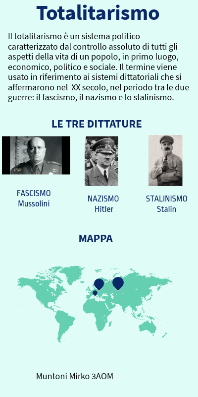 Il totalitarismo è un sistema politico caratterizzato dal controllo assoluto di tutti gli aspetti della vita di un popolo, in primo luogo, economico, politico e sociale. Il termine viene usato in riferimento ai sistemi dittatoriali che si affermarono nel XX secolo, nel periodo tra le due guerre: il fascismo, il nazismo e lo stalinismo.