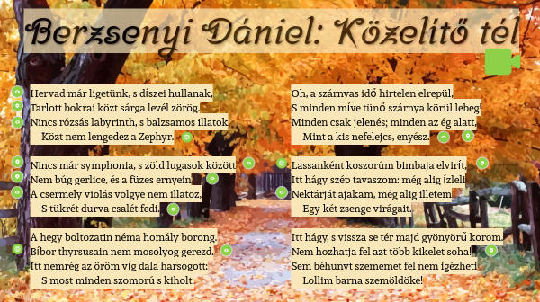 Hervad már ligetünk, s díszei hullanak, Tarlott bokrai közt sárga levél zörög. Nincs rózsás labyrinth, s balzsamos illatok Közt nem lengedez a Zephyr. Nincs már symphonia, s zöld lugasok között Nem búg gerlice, és a füzes ernyein A csermely violás völgye nem illatoz, S tükrét durva csalét fedi. A hegy boltozatin néma homály borong. Bíbor thyrsusain nem mosolyog gerezd. Itt nemrég az öröm víg dala harsogott: S most minden szomorú s kiholt.
