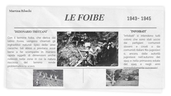 Si tratta di spaccature naturali del terreno rintracciabili presso le montagne del Carso, in Friuli. Le foibe furono il palcoscenico di un orrendo spettacolo che si svolse tra il 1943 ed il 1945: migliaia di uomini furono gettati all’interno di queste fosse, un numero inestimabile di innocenti morirono senza dignità all’interno di questi solchi che accolsero i loro corpi senza vita.