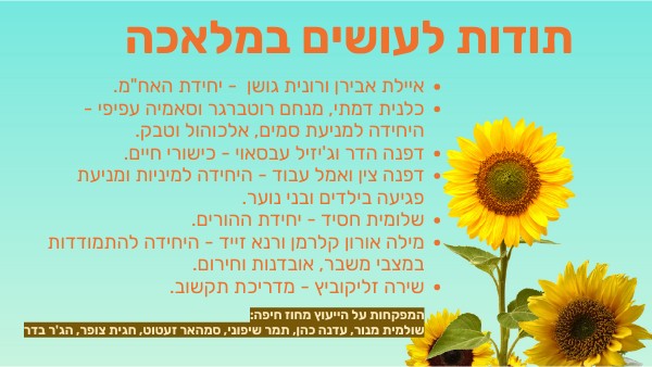- כלנית דמתי, מנחם רוטברגר וסאמיה עפיפי - היחידה למניעת סמים, אלכוהול וטבק.