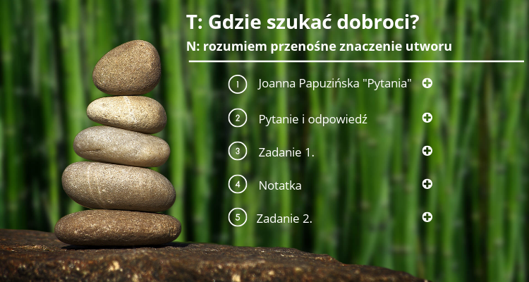 Wiersz pt. …………………… Joanny Papuzińskiej opowiada o ………………… . Osoba mówiąca w wierszu zadaje dużo ………….....… . Próbuje dowiedzieć się, gdzie mieszka ……………....… . Okazuje się, że dobroć jest nie tylko w otaczającym nas świecie, ale również „mieszka w nas ……………………………” . Dobroć to uczucie, którym powinniśmy darzyć innych …………….......…… .