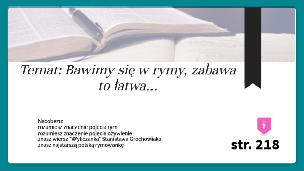 Nacobezu:rozumiesz znaczenie pojęcia rym rozumiesz znaczenie pojęcia ożywienie znasz wiersz "Wyliczanka" Stanisława Grochowiaka znasz najstarszą polską rymowankę