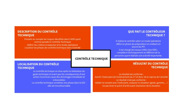 Prendre en compte les risques identifiés dans l’ADR ayant comme parade le Contrôle Technique Définir les critères à respecter et le mode opératoire Localiser les phases de contrôle technique dans l’activité