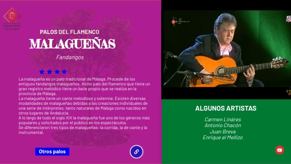 La malagueña es un palo tradicional de Málaga. Procede de los antiguos fandangos malagueños, dicho palo del flamenco que tiene un gran registro melódico tiene un baile propio que se realiza en la provincia de Málaga. La malagueña tiene un cante melodioso y solemne. Existen diversas modalidades de malagueñas debidas a las creaciones individuales de una serie de intérpretes, tanto naturales de Málaga como nacidos en otros lugares de Andalucía. A lo largo de todo el siglo XIX la malagueña fue uno de los géneros más populares y solicitados por el público en los espectáculos. Se diferenciaron tres tipos de malagueñas: la corrida, la de cante y la instrumental.