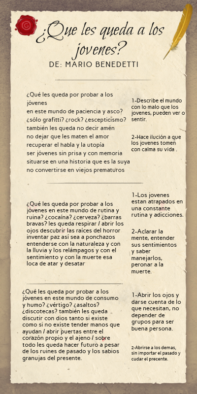 ¿Qué les queda por probar a los jóvenes en este mundo de paciencia y asco? ¿sólo grafitti? ¿rock? ¿escepticismo? también les queda no decir amén no dejar que les maten el amor recuperar el habla y la utopía ser jóvenes sin prisa y con memoria situarse en una historia que es la suya no convertirse en viejos prematuros