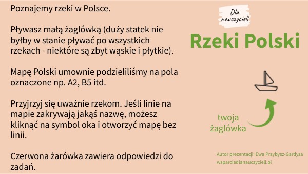 Poznajemy rzeki w Polsce. Pływasz małą żaglówką (duży statek nie byłby w stanie pływać po wszystkich rzekach - niektóre są zbyt wąskie i płytkie). Mapę Polski umownie podzieliliśmy na pola oznaczone np. A2, B5 itd. Przyjrzyj się uważnie rzekom. Jeśli linie na mapie zakrywają jakąś nazwę, możesz kliknąć na symbol oka i otworzyć mapę bez linii. Czerwona żarówka zawiera odpowiedzi do zadań.