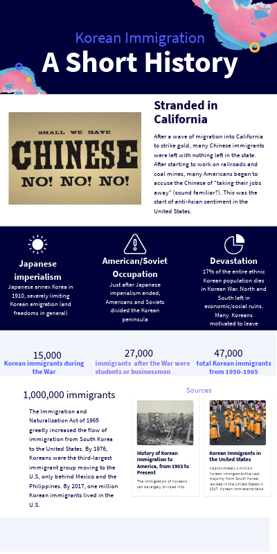 The Immigration and Naturalization Act of 1965 greatly increased the flow of immigration from South Korea to the United States. By 1976, Koreans were the third-largest immigrant group moving to the U.S, only behind Mexico and the Philippines. By 2017, one million Korean immigrants lived in the U.S.