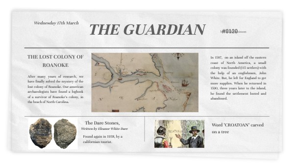 After many years of research, we have finally solved the mystery of the lost colony of Roanoke. Our american archaeologists have found a logbook of a survivor of Roanoke's colony, in the beach of North Carolina.