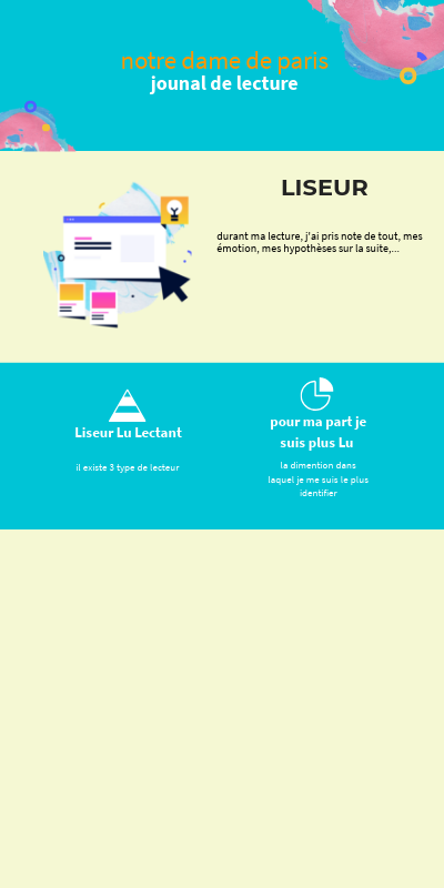 Mon expérience en tant que liseur : La plupart du temps, je lisais le soir dans mon lit. J'apprécie lire dans une position comfortable et dans un moment calme car cela me facilite la tâche pour rentrer dans la lecture. Habituellement, j'ai du mal à rentrer dans un livre car cela ne m'intéresse que très peu mais pour Notre dame de Paris, la lecture était simple. Je me faisais facilement des images mentales, par exemple, à plusieurs moments du livre je me suis imaginé être un drône qui parcourt Paris en même temps que les personnages. Cette sensation était très agréable à vivre.