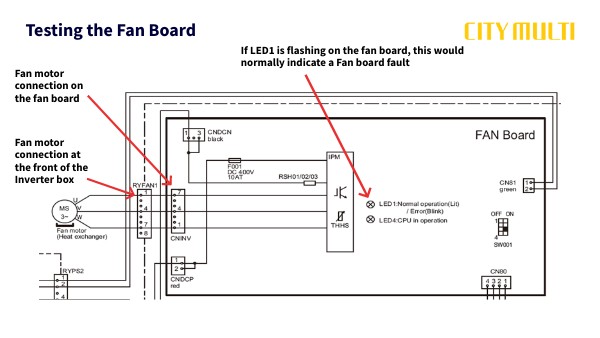 Power off the system and wait atleast 2 minutes Disconnect the fan motor at connection RYFAN1 Change SW7 dip switch 2 to the On position on Control board Power the system back on and make sure the power supply voltages are correct Activate test operation Test voltage output at RYFAN1 from neutral to each of the 3 pin connections The voltage should be the same constant voltage on all 3 connections between 90-300VAC If you have a larger VRF unit with 2 x fan motors you will need to set SW7 dip 4 on also