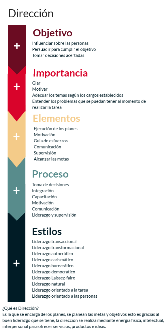 ¿Qué es Dirección? Es la que se encarga de los planes, se planean las metas y objetivos esto es gracias al buen liderazgo que se tiene, la dirección se realiza mediante energía física, intelectual, interpersonal para ofrecer servicios, productos e ideas.