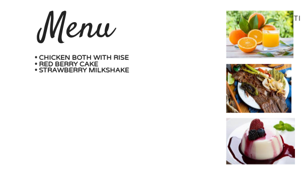 • Chicken both with rise• red berry cake • strawberry milkshake