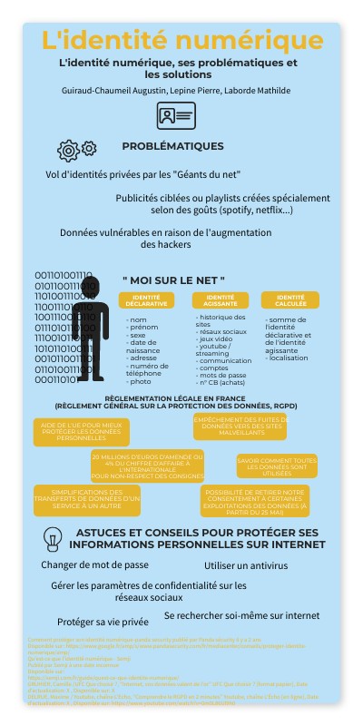 Comment protéger son identité numérique-panda security publié par Panda sécurity il y a 2 ans Disponible sur: https://www.google.fr/amp/s/www.pandasecurity.com/fr/mediacenter/conseils/proteger-identite-numerique/amp/ Qu’est-ce que l’identité numérique - Semji Publié par Semji à une date inconnue Disponible sur: https://semji.com/fr/guide/quest-ce-que-identite-numerique/ GRUHIER, Camille /UFC Que choisir ?, “Internet, vos données valent de l’or” UFC Que choisir ? [format papier], Date d’actualisation: X , Disponible sur: X DELRUE, Maxime / Youtube, chaîne L’Echo, “Comprendre le RGPD en 2 minutes” Youtube, chaîne L'Écho [en ligne], Date d’actualisation: X , Disponible sur: https://www.youtube.com/watch?v=0m0L86Ul9h0