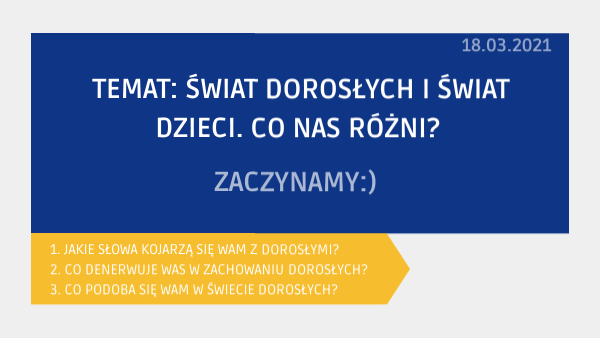 1. Jakie słowa kojarzą się wam z dorosłymi? 2. Co denerwuje Was w zachowaniu dorosłych? 3. Co podoba się wam w świecie dorosłych?