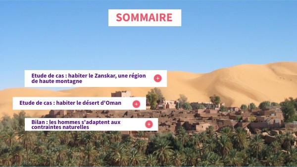 - Les Omanis se sont adaptés à l'aridité. Il existe des oasis ( endroits en plein désert présentant de la végétation grâce à un point d’eau ) aménagées avec la construction d'un système d'irrigation ( d'arrosage ) très ancien : le falaj. Des palmeraies ( champs plantés de palmiers ) s'y sont formées. 3- Bilan : surmonter les contraintes naturelles pour en faire des atouts