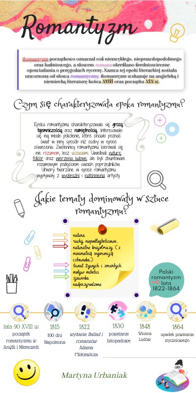 Epoka romantyzmu charakteryzowała się grozą, tajemniczością oraz namiętnością.. Interesowało się nią młode pokolenie, które chciało poznać świat w inny sposób niż osoby w epoce oświecenia. Zwolennicy romantyzmu kierowali się nie rozumem, lecz uczuciami. Uwielbiali naturę, folklor oraz wierzenia ludowe, ale byli zbuntowani rozumowym podejściem swoich poprzedników. Utwory tworzone w epoce romantyzmu wypływały z wyobraźni i natchnienia artysty.