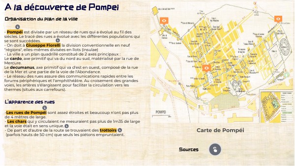 -Les rues de Pompéi sont assez étroites et beaucoup n'ont pas plus de 4 mètres de large. - Les chars qui y circulaient ne mesuraient pas plus de 1m35 de large et la voie était en sens unique. - De part et d'autre de la route se trouvaient des trottoirs (parfois hauts de 50 cm) que seuls les piétons empruntaient.
