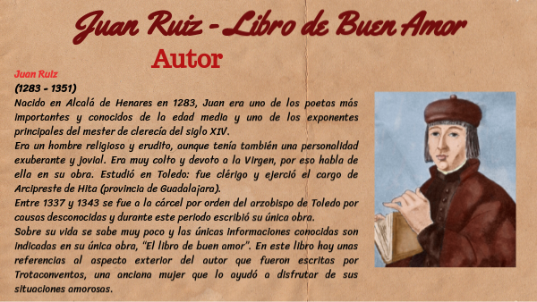 Juan Ruiz (1283 - 1351) Nacido en Alcalá de Henares en 1283, Juan era uno de los poetas más importantes y conocidos de la edad media y uno de los exponentes principales del mester de clerecía del siglo XIV. Era un hombre religioso y erudito, aunque tenía también una personalidad exuberante y jovial. Era muy colto y devoto a la Virgen, por eso habla de ella en su obra. Estudió en Toledo: fue clérigo y ejerció el cargo de Arcipreste de Hita (provincia de Guadalajara). Entre 1337 y 1343 se fue a la cárcel por orden del arzobispo de Toledo por causas desconocidas y durante este periodo escribió su única obra. Sobre su vida se sabe muy poco y las únicas informaciones conocidas son indicadas en su única obra, “El libro de buen amor”. En este libro hay unas referencias al aspecto exterior del autor que fueron escritas por Trotaconventos, una anciana mujer que lo ayudó a disfrutar de sus situaciones amorosas.