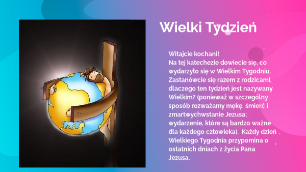Witajcie kochani!Na tej katechezie dowiecie się, co wydarzyło się w Wielkim Tygodniu. Zastanówcie się razem z rodzicami, dlaczego ten tydzień jest nazywany Wielkim? (ponieważ w szczególny sposób rozważamy mękę, śmierć i zmartwychwstanie Jezusa; wydarzenie, które są bardzo ważne dla każdego człowieka). Każdy dzień Wielkiego Tygodnia przypomina o ostatnich dniach z życia Pana Jezusa.