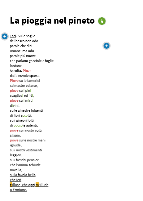 Taci. Su le soglie del bosco non odo parole che dici umane; ma odo parole più nuove che parlano gocciole e foglie lontane. Ascolta. Piove dalle nuvole sparse. Piove su le tamerici salmastre ed arse, piove su i pini scagliosi ed irti, piove su i mirti divini, su le ginestre fulgenti di fiori accolti, su i ginepri folti di coccole aulenti, piove su i nostri volti silvani, piove su le nostre mani ignude, su i nostri vestimenti leggieri, su i freschi pensieri che l'anima schiude novella, su la favola bella che ieri t'illuse, che oggi m'illude, o Ermione.