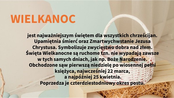 jest najważniejszym świętem dla wszystkich chrześcijan. Upamiętnia śmierć oraz Zmartwychwstanie Jezusa Chrystusa. Symbolizuje zwycięstwo dobra nad złem. Święta Wielkanocne są ruchome tzn. nie wypadają zawsze w tych samych dniach, jak np. Boże Narodzenie. Obchodzone sąw pierwszą niedzielę po wiosennej pełni księżyca, najwcześniej 22 marca, a najpóźniej 25 kwietnia. Poprzedza je czterdziestodniowy okres postu.
