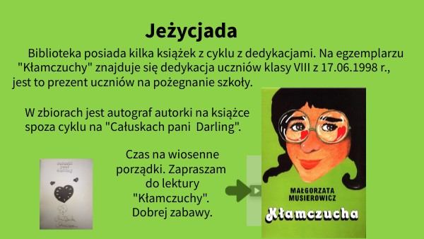 Biblioteka posiada kilka książek z cyklu z dedykacjami. Na egzemplarzu "Kłamczuchy" znajduje się dedykacja uczniów klasy VIII z 17.06.1998 r., jest to prezent uczniów na pożegnanie szkoły.