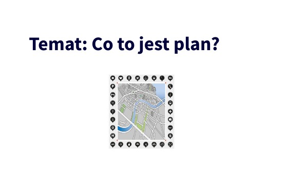 Jeśli spojrzymy na powierzchnię Ziemi z dużej wysokości, zobaczymy domy, ulice, pola i lasy. Plan przedstawia obraz niewielkiego terenu lub innego przedmiotu widzianego z góry przy zastosowaniu odpowiedniego pomniejszenia. Plany najczęściej pokazują niewielkie obszary, np. miasta, wsie lub nawet pojedyncze osiedla czy budynki. Na planie widzimy interesujący nas obszar bardzo szczegółowo. Jego powierzchnię często dzieli się na kwadraty oznaczone literami i cyframi. Ułatwia to odnalezienie na przykład ulicy lub innych miejsc, których szukamy.