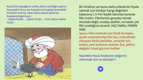 Bir hindiniz var bunu daha yüksek bir fiyata satmak için hindiye hangi değerleri katarsınız.( 3-4’er kişilik takımlar kurarak fikir üretin. Fikirleriniz gerçekçi olmak zorunda değil, sıradışı olabilir, ne kadar çok fikir ürettiğiniz önemli. KAÇ FARKLI FİKRİN VAR) İpucu: Fikir üretmek için hindi ile başka şeyler arasında köprüler kur, orijinalinde olmayan farklı özellikler, amaçlar için kullan, yeni kullanım alanları bul, şeklini değiştir, hayal gücünü kulllan