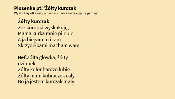 Żółty kurczak Ze skorupki wyskakuję, Mama kurka mnie pilnuje A ja biegam tu i tam Skrzydełkami macham wam. Ref.Żółta główka, żółty dziubek Żółty kolor bardzo lubię Żółty mam kubraczek cały Bo ja jestem kurczak mały.