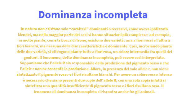 In natura non esistono solo “caratteri" dominanti o recessivi, come aveva ipotizzato Mendel, ma nella maggior parte dei casi si hanno situazioni più complesse: ad esempio, in molte piante, come la bocca di leone, esistono due varietà: una a fiori rossi e l'altra a fiori bianchi, ma nessuna delle due caratteristiche è dominante. Così, incrociando piante delle due varietà, si ottengono piante tutte a fiori rosa, un colore intermedio fra quelli dei genitori. Il fenomeno, detto dominanza incompleta, può essere così interpretato. Supponiamo che l'allele R sia responsabile della produzione del pigmento rosso e che l'allele r non ne consenta la produzione. Allora, in presenza del solo allele r, non viene sintetizzato il pigmento rosso e i fiori risultano bianchi. Per avere un colore rosso intenso è necessario che siano presenti due copie dell'allele R; con una sola copia infatti si sintetizza una quantità insufficiente di pigmento rosso e i fiori risultano rosa. Il fenomeno di dominanza incompleta si riscontra anche fra gli animali.