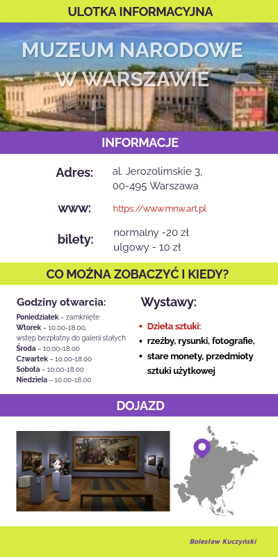 Poniedziałek – zamknięte Wtorek – 10.00-18.00,wstęp bezpłatny do galerii stałych Środa – 10.00-18.00 Czwartek – 10.00-18.00 Sobota – 10.00-18.00 Niedziela – 10.00-18.00