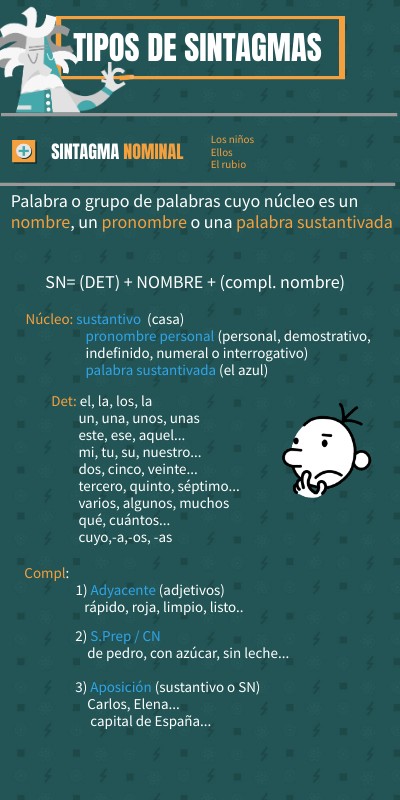 - Francisco (núcleo) - Una (det) mañana (núcleo) primaveral (CN) - Los (det) alumnos (núcleo) de Matemáticas (CN) - El (det) río (núcleo) Duero (aposición; CN) - Berlín (núcleo), capital de Alemania (aposición; CN) - Aquellos (determinante) verdes (CN) campos (núcleo) soleados (CN) - Mi (det) pierna (núcleo) izquierda (CN) - Los (det) dos (det) coches (N) de Pedro (CN) - El (det) gato (núcleo) mío (det)
