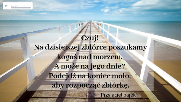 Czuj! Na dzisiejszej zbiórce poszukamy kogoś nad morzem. A może na jego dnie? Podejdź na koniec molo, aby rozpocząć zbiórkę.