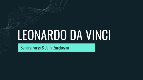 1. Jego pełne imię to Leonardo di ser Piero da Vinci. 2. Nie ukończył żadnej szkoły. 3. Był oburęczny. 4. Potrafił pisać pismem lustrzanym. 5. Anatomii człowieka uczył się z sekcji zwłok. 6. Był wegetarianinem. 7. Potrafił pisać jedną ręką i malować drugą. 8. Był uzdolniony w wielu dziedzinach, ale najbardziej lubił wynalazki.