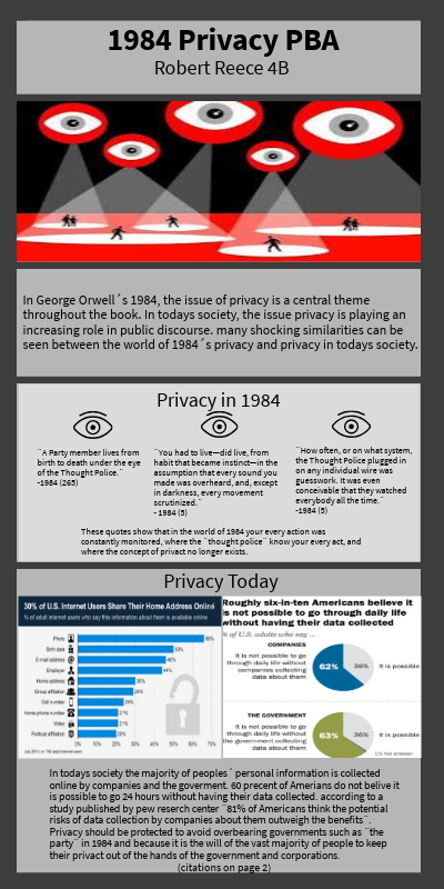 In George Orwell´s 1984, the issue of privacy is a central theme throughout the book. In todays society, the issue privacy is playing an increasing role in public discourse. many shocking similarities can be seen between the world of 1984´s privacy and privacy in todays society.