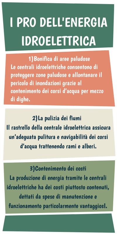 3)Contenimento dei costiLa produzione di energia tramite le centrali idroelettriche ha dei costi piuttosto contenuti, dettati da spese di manutenzione e funzionamento particolarmente vantaggiosI.