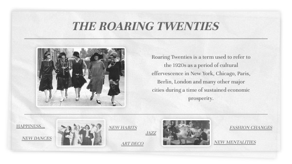 Roaring Twenties is a term used to refer to the 1920s as a period of cultural effervescence in New York, Chicago, Paris, Berlin, London and many other major cities during a time of sustained economic prosperity.