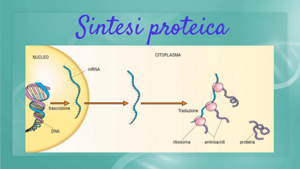 la sintesi proteica è il processo biochimico mediante il quale l'informazione genetica contenuta nel m-RNA (RNA messaggero) viene convertita in proteine. Le proteine sono macromolecole costituite da precise sequenze di 20 amminoacidi diversi tra loro.
