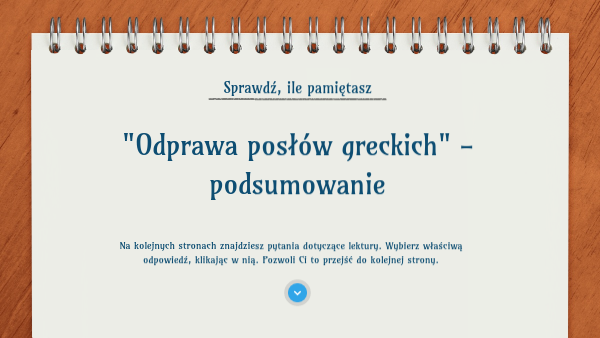 Na kolejnych stronach znajdziesz pytania dotyczące lektury. Wybierz właściwą odpowiedź, klikając w nią. Pozwoli Ci to przejść do kolejnej strony.