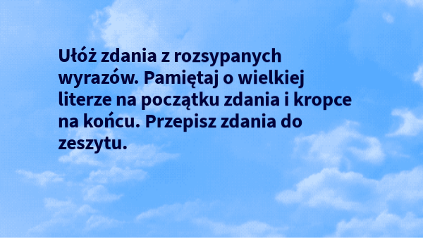 Ułóż zdania z rozsypanych wyrazów. Pamiętaj o wielkiej literze na początku zdania i kropce na końcu. Przepisz zdania do zeszytu.