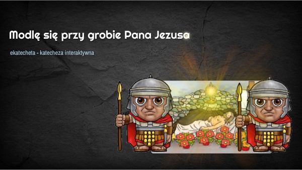 – Co widzicie na ilustracji? – Kogo przedstawia fi gura złożona w grobie? – O czym przypomina krzyż stojący obok grobu? – Kto pilnuje grobu? – Co jest umieszczone na środku nad fi gurą Pana Jezusa?