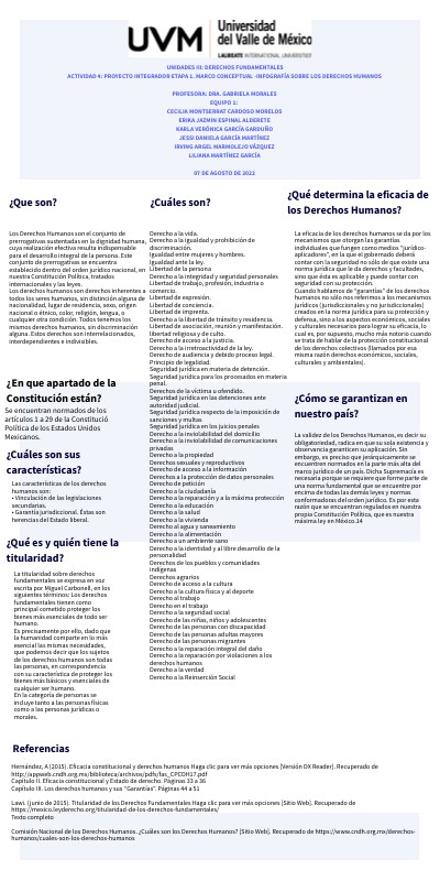 DERECHOS HUMANOS UNIDADES III: DERECHOS FUNDAMENTALES ACTIVIDAD 4: PROYECTO INTEGRADOR ETAPA 1. MARCO CONCEPTUAL -INFOGRAFÍA SOBRE LOS DERECHOS HUMANOS PROFESORA: DRA. GABRIELA MORALES EQUIPO 1: CECILIA MONTSERRAT CARDOSO MORELOS ERIKA JAZMIN ESPINAL ALDERETE KARLA VERÓNICA GARCÍA GARDUÑO JESSI DANIELA GARCÍA MARTÍNEZ IRVING ARGEL MARMOLEJO VÁZQUEZ LILIANA MARTÍNEZ GARCÍA 07 DE AGOSTO DE 2022