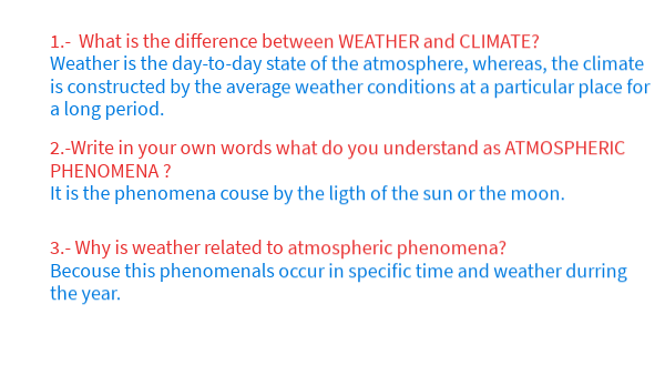 2.-Write in your own words what do you understand as ATMOSPHERIC PHENOMENA ? It is the phenomena couse by the ligth of the sun or the moon.
