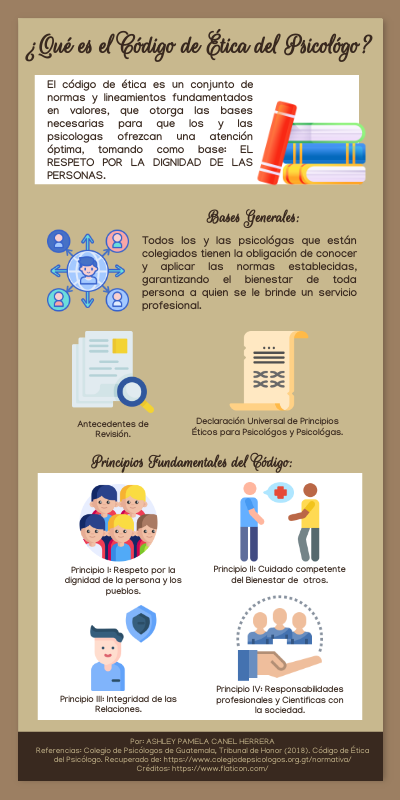 Por: ASHLEY PAMELA CANEL HERRERA Referencias: Colegio de Psicólogos de Guatemala, Tribunal de Honor (2018). Código de Ética del Psicólogo. Recuperado de: https://www.colegiodepsicologos.org.gt/normativa/ Créditos: https://www.flaticon.com/